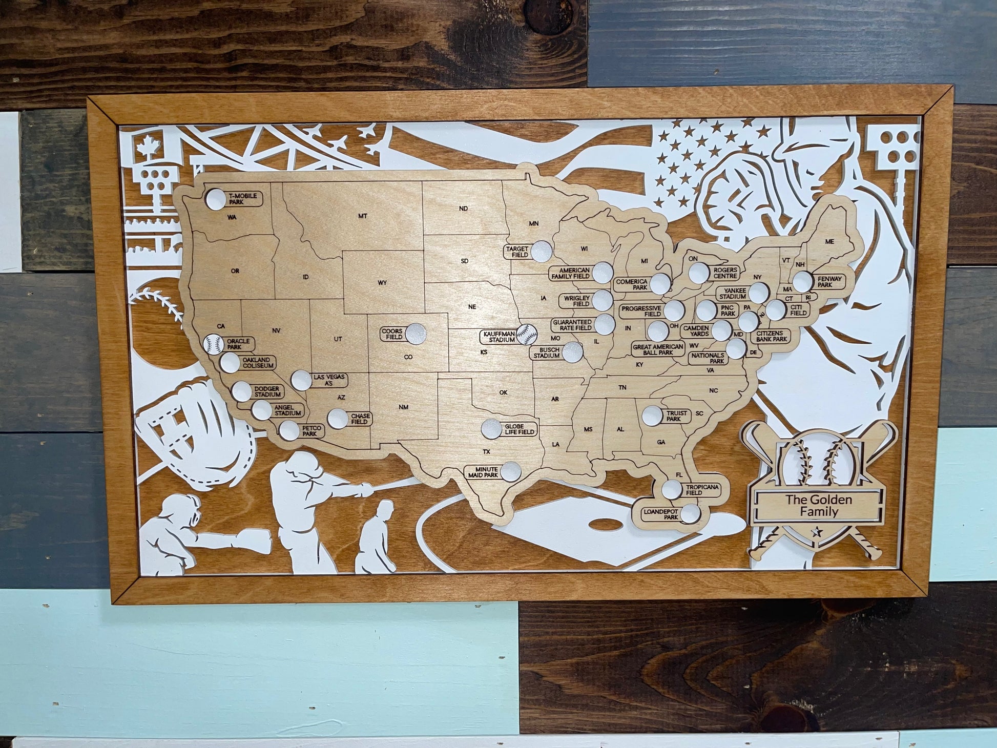 Each map is hand-painted, stained & sealed. This map is roughly 10.75 by 18 inches. This map will come with a bag of wooden baseballs that you will attach to the map via double stick tape-- making the process so easy! The back will come with a sawtooth hanger. The nameplate can be customized with your choice of words or you can choose the travel map that says "Baseball Travel Map" which will be displayed across the bottom. If you would like this option, select the option of "Baseball Travel Map".